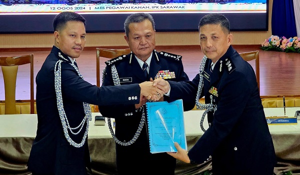 Majlis menandatangani nota serah terima tugas jawatan antara ACP Ahsmon Bajah dan ACP Mohamad Farhan Lee Abdullah disaksikan oleh Pesuruhjaya Polis Sarawak,Datuk Mancha Ata di Mes Pegawai Ibu Pejabat Polis Kontingen Sarawak di Kuching.