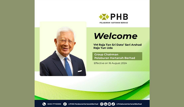 KUALA LUMPUR,27 Ogos- Pelaburan Hartanah Bhd (PHB) mengumumkan pelantikan Raja Tan Sri Arshad Raja Tun Uda sebagai pengerusi bebas bukan eksekutif baharu berkuat kuasa 16 Ogos,2024,susulan persaraan Tan Sri Ahmad Nizam Salleh pada 1 Ogos,2024.