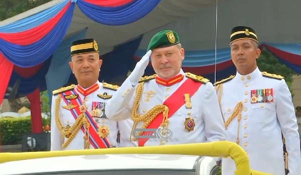 Sultan Ibrahim memeriksa perbarisan pada istiadat mengarak Panji-Panji Yang di-Pertuan Agong hari ini