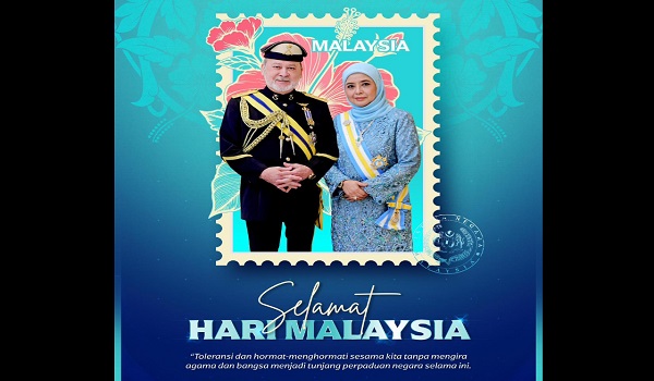 KUALA LUMPUR,16 September- Yang di-Pertuan Agong Sultan Ibrahim dan Raja Permaisuri Agong Raja Zarith Sofiah menzahirkan ucapan selamat menyambut Hari Malaysia.