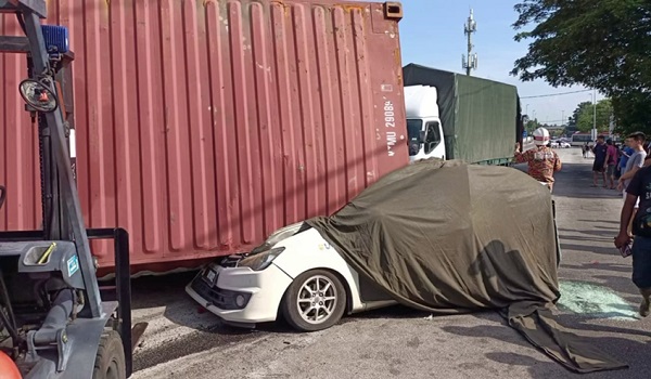 Keadaan kenderaan yang dihempap kontena yang terjatuh daripada sebuah treler