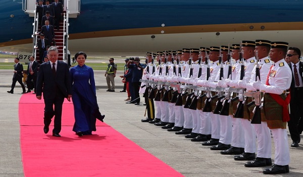 Pesawat membawa rombongan To Lam dan isteri Ngo Thi Phuong Ly beserta deligasi mendarat di Kompleks Bunga Raya Lapangan Terbang Antarabangsa Kuala Lumpur (KLIA) di sini pada 11.15 pagi.