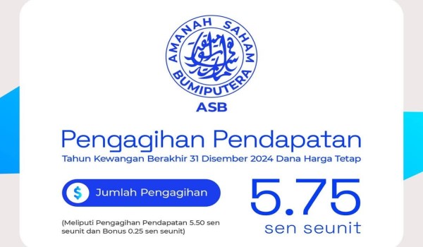 KUALA LUMPUR,24 Disember- Amanah Saham Nasional Berhad (ASNB),umum agihan pendapatan 5.75 sen seunit,bagi dana utamanya,Amanah Saham Bumiputera (ASB),untuk tahun kewangan berakhir 31 Disember 2024.
