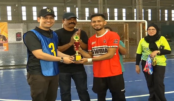 Dr Mohammed Taufiq Johari (KIRI) menyampaikan hadiah kepada pemenang perlawanan bola sepak berjalan di Amanjaya Arena Sport,Sungai Petani / RTM