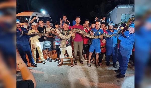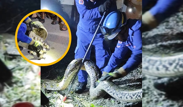 Ular sawa sepanjang lima meter dan seberat 50 kilogram itu berjaya ditangkap bersama 30 biji telurnya/APM