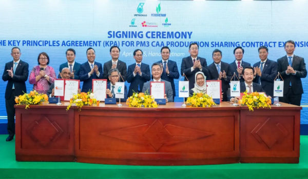 HANOI,11 April – PETRONAS melalui Malaysia Petroleum Management (MPM) dan Kumpulan Minyak dan Gas Vietnam (PETROVIETNAM) memeterai Perjanjian Prinsip Utama (KPA) bagi melanjutkan Kontrak Perkongsian Pengeluaran (PSC) dan Perjanjian Jualan Gas Huluan (UGSA) untuk Kawasan Pengaturan Komersial PM3 (PM3 CAA) selama 20 tahun lagi.