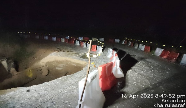 Sebelum ini,rekahan dan pergerakan tanah telahdikesan di jalan lencongan di Kilometer 35,Jalan Gua Musang-Jeli pada Jumaat minggu lalu,dipercayai berpunca daripada cuaca hujan serta bebanan kenderaan berat yang melalui jalan berkenaan.