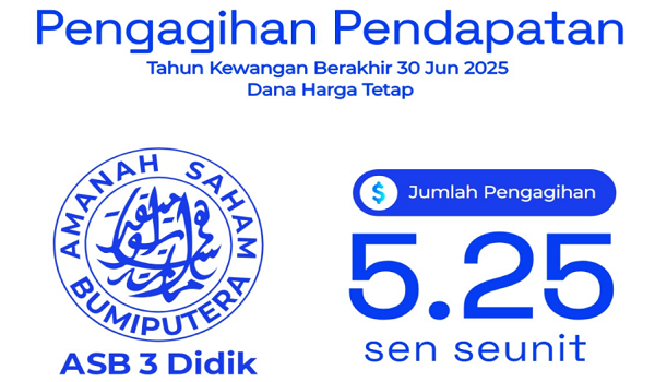 KUALA LUMPUR,30 Jun - Amanah Saham Nasional Berhad (ASNB) mengumumkan pengagihan pendapatan untuk dana harga tetap iaitu Amanah Saham Bumiputera 3 Didik (ASB 3 Didik) 5.25 sen seunit bagi tahun kewangan berakhir 30 Jun 2025.