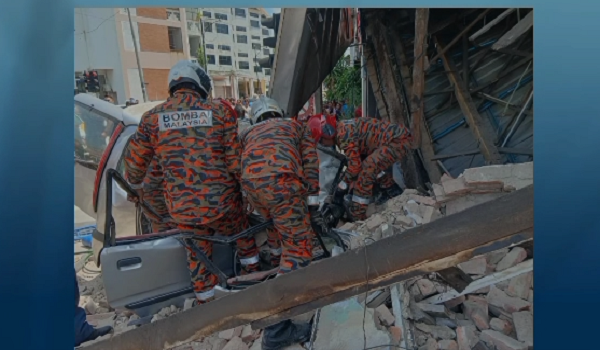 Terdahulu,tular di media sosial video berdurasi 13 saat memaparkan sebuah kereta merempuh bangunan dua tingkat sehingga kenderaan itu dipenuhi batu bata dari bangunan yang dalam pembinaan berkenaan. - BERNAMA