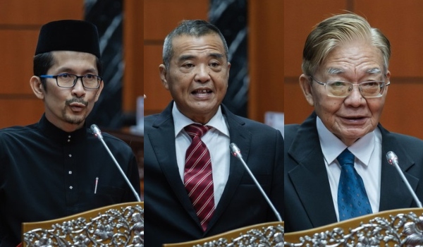 Dr. Jufitri Joha (kiri),Datuk Wu Him Ven (tengah) dan Datuk Leong Ngah Ngah mengangkat sumpah jawatan sebagai Ahli Dewan Negara (Senator) di hadapan Yang Dipertua Dewan Negara Datuk Awang Bemee Awang Ali Basah di Bangunan Parlimen hari ini/ BERNAMA